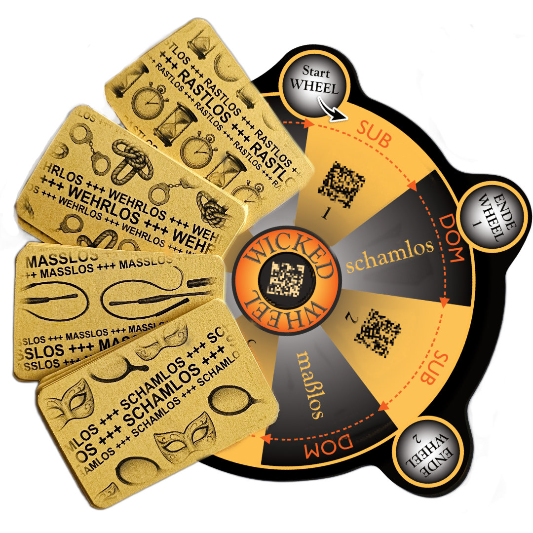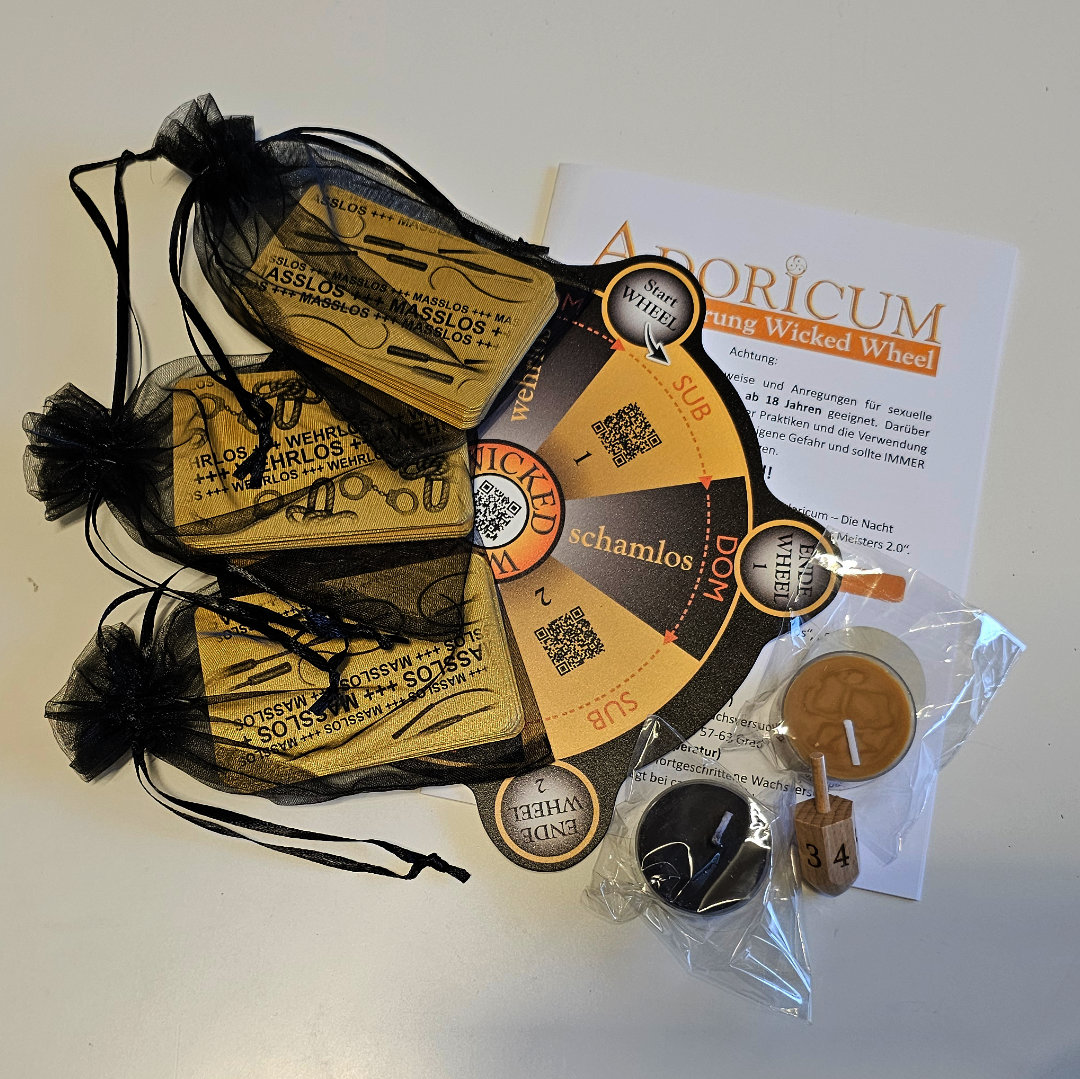Das Herz des Spiels ist der einzigartige Wheelwürfel, ein speziell angefertigter Kreisel, der das Schicksal mit einem eleganten Dreh bestimmt. Dieser Würfel lenkt euch durch vier fesselnde Kategorien – Wehrlos, Schamlos, Maßlos und Rastlos – mit Aufgaben, die von komplexem Bondage über exhibitionistische Demütigung bis hin zu intensiven physischen und psychologischen Herausforderungen reichen. Jede Aufgabe ist darauf ausgelegt, die Verbindung zwischen Dom und Sub zu vertiefen, während ihr eure Grenzen in einem sicheren, einvernehmlichen Rahmen auslotet.